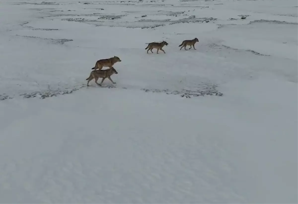 Sivas’ta Dron ile Görüntülenen 4 Kurt Karlı Arazide Yiyecek Arıyor
